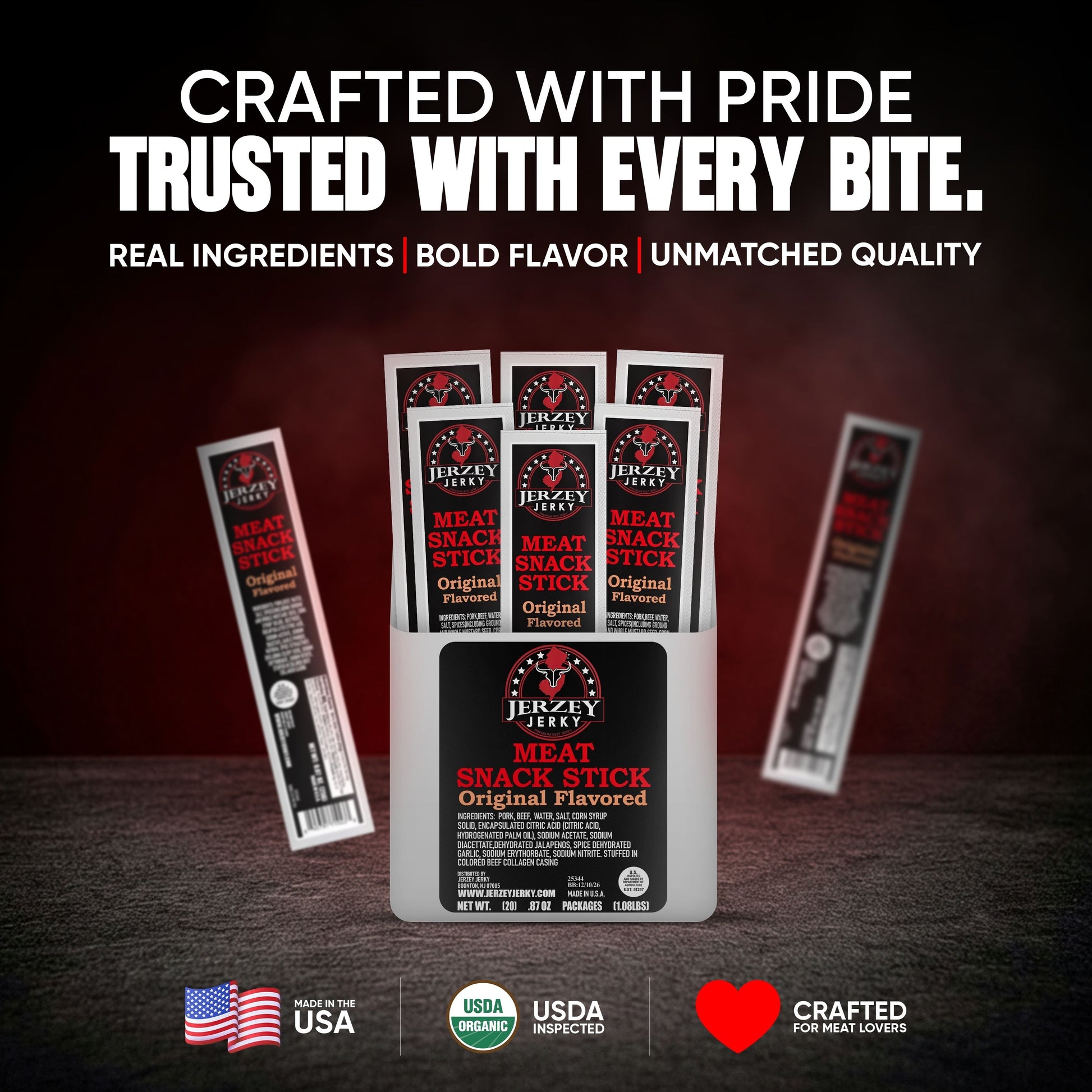 Made with pride in the USA, JERZEY JERKY sticks are crafted for true meat lovers. We use a blend of pork and beef, seasoned to perfection to create that classic, original flavor. Each batch is USDA inspected, ensuring unmatched quality and safety in every package.